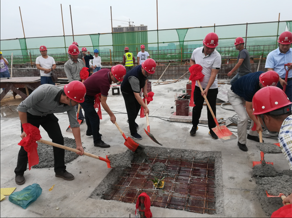 2018523日,公司在江龍灘基地隆重舉行綜合樓主體封頂儀式。莊勝集團有限公司總裁周建和先生,湖南湘中礦業(yè)集團有限公司總裁楊克偉先生、副總裁劉璐先生親臨基地現(xiàn)場表示祝賀。公司高管在集團副總裁兼婁底工程建設(shè)有限公司董事長張愛慧先生的帶領(lǐng)下,共同揮鏟,為大樓主體封頂添上最后一斗混凝土。