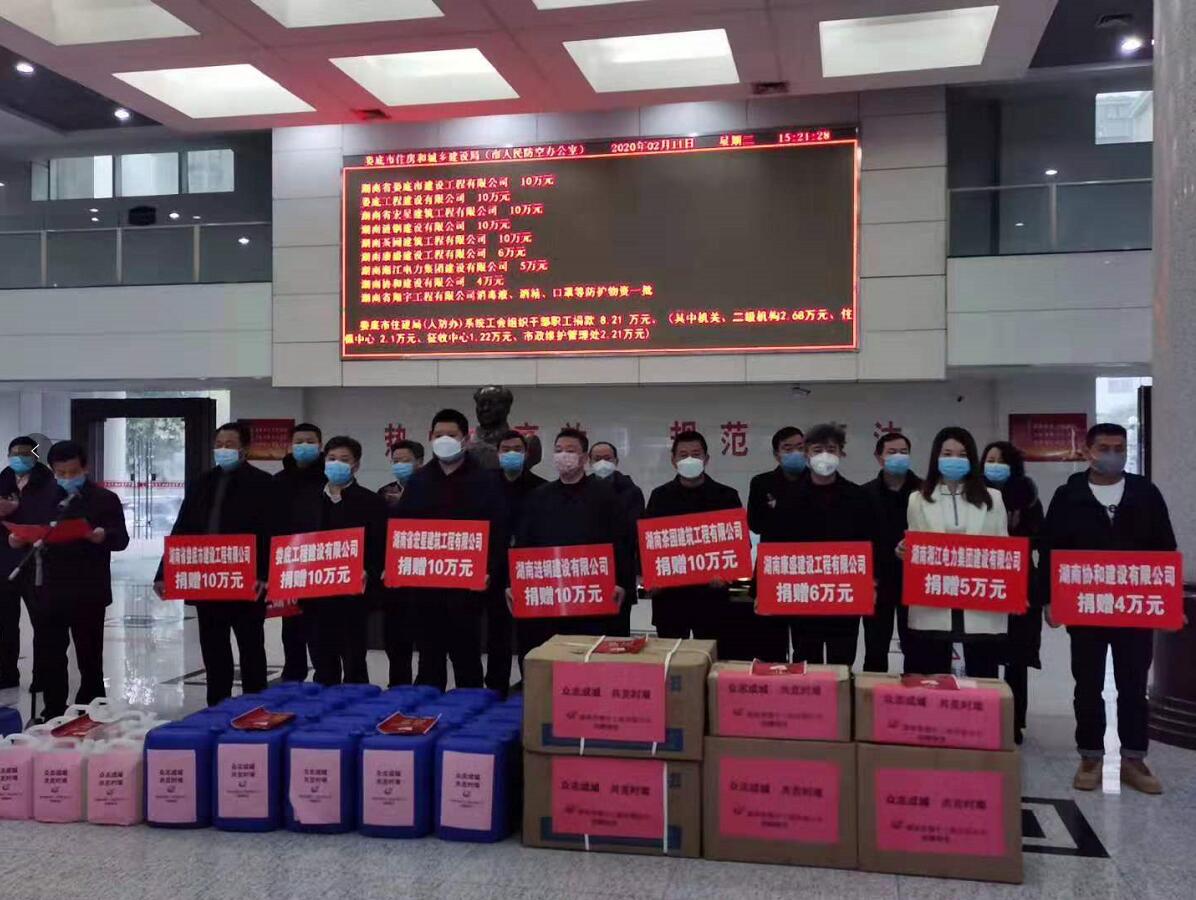 “病毒無情人有情”、“一方有難八方支援”!2020年2月11日,在婁底市住建局(人防辦)組織的市住建(人防)領(lǐng)域建筑業(yè)企業(yè)、房地產(chǎn)企業(yè)及局(辦)系統(tǒng)工會(huì)“抗擊疫情,勇?lián)?zé)任”捐贈(zèng)儀式上,公司總經(jīng)理、法人代表胡勁代表婁底工程建設(shè)有限公司捐贈(zèng)人民幣10萬元,為抗擊新冠病毒肺炎疫情盡企業(yè)的一份社會(huì)責(zé)任。公司董事長(zhǎng)張愛慧參加了捐贈(zèng)儀式。