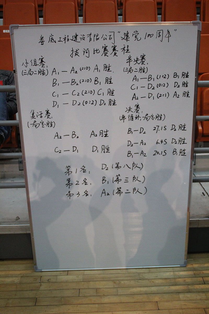 本次比賽根據(jù)隨機(jī)抽簽組隊(duì),以“12人對(duì)12人拔河,此次賽制分為淘汰賽、復(fù)活賽、半決賽、決賽四個(gè)階段。在比賽過程中,各隊(duì)人員都顯示出最強(qiáng)的比賽陣容,齊心協(xié)力,勇爭(zhēng)第一!為保證比賽的公平、公正、公開,賽會(huì)特設(shè)裁判1名,記錄員1名,維持秩序人員4名,另外還有現(xiàn)場(chǎng)攝影者1名。